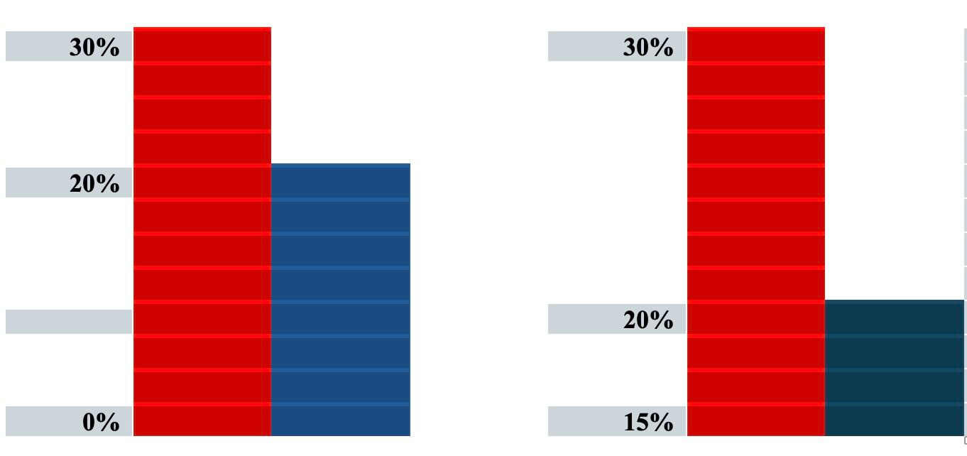 The graphs are representing the same data but the graph on the left uses 0% as the baseline whereas the graph on the right uses 15% as the baseline. The difference between the bars in each graph is 10% but the visual effect of the graph on the right could suggest to the casual observer a larger difference in effect. It is best practice to always use zero as the baseline whenever presenting comparisons of data in a graph.